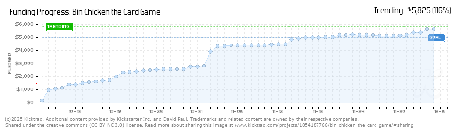 Hello Bin Chicken friends! Yes indeed, Bin Chicken the Card Game has reached it's funding goal! It has been a pretty wild ride, as I have been attending every board games club and event that I can find. A particular stand out was being the first... (Read More)