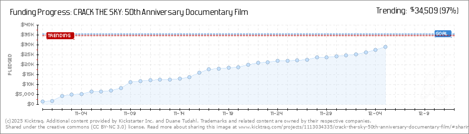 Welcome to the second Backer Update for the CRACK THE SKY 50th Anniversary Documentary Kickstarter campaign. I'd like to sincerely thank all who have pledged to this campaign, shared it, and commented so favorably. Early pledges count a lot because... (Read More)