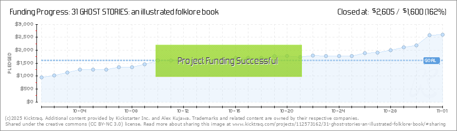 Hello all,Thank you again for your help in getting my 31 GHOST STORIES illustrated folklore book printed by pledging to my Kickstarter! We are now at less than 10 days left of this Kickstarter campaign, and unfortunately, we have not managed to... (Read More)