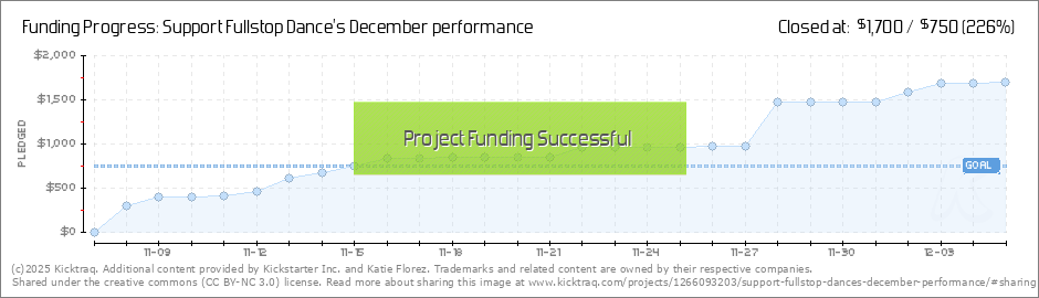 1 kickstarter, 7 days, 12 backers, $750 goal reached!!! THANK YOU. We still have 19 more days and we have BIG plans for 2017 so keep on giving. We'll be hoarding the money away like little squirrels for our spring season. We want to dance for you!!!... (Read More)
