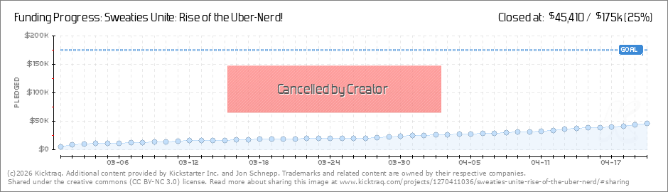 Backers, I've been talking with an independent backer, and it looks like "Sweaties Unite: Rise of the Uber-Nerd" might have its full budget to make the film later this summer. I'm pulling the kickstarter, and I'd like to thank all the over 650... (Read More)