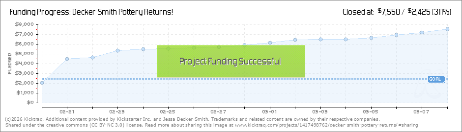 Overnight the pledge came in that put the Decker-Smith Pottery Returns project over the top. That means - in less than 18 hours (!), thanks to you, this campaign has been a success! I am humbled and overwhelmed by the outpouring of support and I... (Read More)