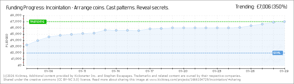 Hello!I promise, a very brief update. First Stretch Goal metThis is now available for those wishing to upgrade their set to the silver-effect reward - a full set of Incointation coins, the cloth bag, Almanack and the Walnut veneer mini display board... (Read More)