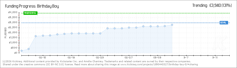 Help your backers reach your daily goals and help others see how you're doing. It's easy, with Kicktraq Mini.Here are a few quick snippits of code you can use to embed your personalized widget on your website, in your blog, and even on your favorite forum.