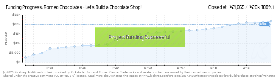 We are more than 50% of our Kickstarter campaign goal of $20,000! Wow! I want to take a moment to thank all the BACKERS for your support to build Romeo Chocolates. I am determined to build a fine chocolate shop for all of us to enjoy, and your... (Read More)