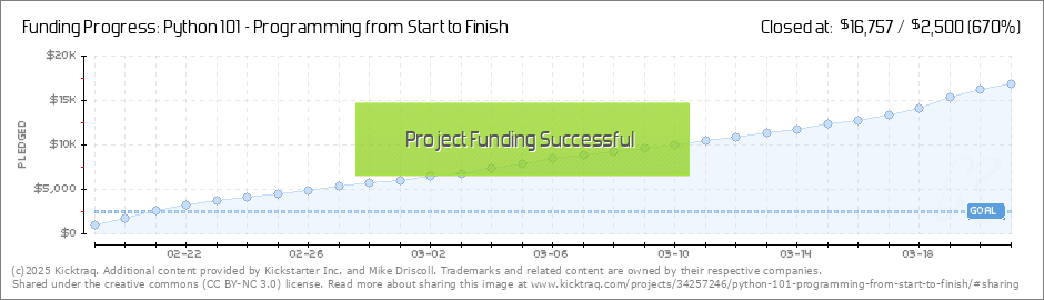 I just wanted to thank all my backers for getting us up to our first stretch goal! That means I'll be writing a 5th section of the book that's for intermediate readers. It will cover the following topics: lambda decorators properties debugging ... (Read More)