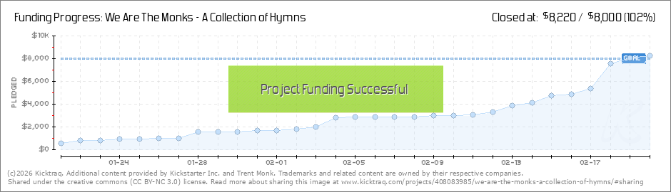 Help your backers reach your daily goals and help others see how you're doing. It's easy, with Kicktraq Mini.Here are a few quick snippits of code you can use to embed your personalized widget on your website, in your blog, and even on your favorite forum.