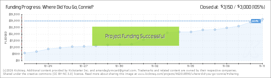 We did it! WHERE DID YOU GO, CONNE? had been chosen as a Kickstarter "Project We Love!" That means that more people will be able to find us! And with your help sharing it, we can reach the finish line together. With 8 days left in the campaign,... (Read More)