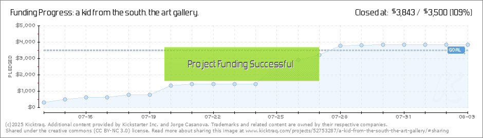You guys made it happen! We officially hit our $3,500 goal! I really appreciate everybody who pledged or spread the word! Now the real work starts for me and making sure I give you guys and Houston an amazing art gallery. I will be able to put the... (Read More)