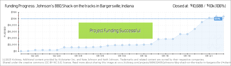 We are down to just over six days! We appreciate all our backers to this point, help us spread the word, we feel we can still get fully funded, with your help! Share the word and let's get this done. Johnson's BBQ Shack Team (Read More)