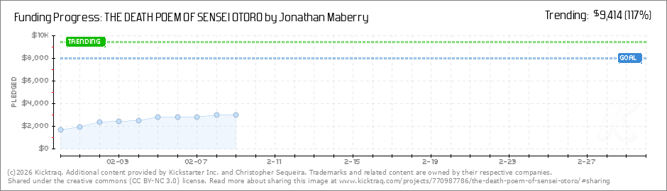 After Day 1, THE DEATH POEM OF SENSEI OTORO is now at 20% funded. Thank you all so much for your support from Jonathan Maberry and the team. It's bubbling along nicely and we hope you can help share the link around to get as many eyes on the project... (Read More)