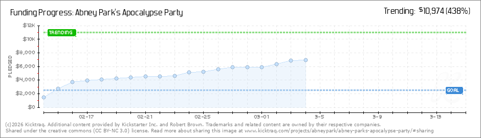 Help your backers reach your daily goals and help others see how you're doing. It's easy, with Kicktraq Mini.Here are a few quick snippits of code you can use to embed your personalized widget on your website, in your blog, and even on your favorite forum.
