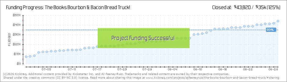 OMG. OMG. OMG!!!! A full two weeks before our Kickstarter campaign ends, you all pushed us over our $35,000 goal! A fully funded campaign for the Books Bourbon & Bacon Bread Truck beat Baby Boy out of the gates (or womb)! Thank you to everyone... (Read More)