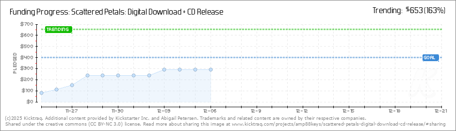 Help your backers reach your daily goals and help others see how you're doing. It's easy, with Kicktraq Mini.Here are a few quick snippits of code you can use to embed your personalized widget on your website, in your blog, and even on your favorite forum.