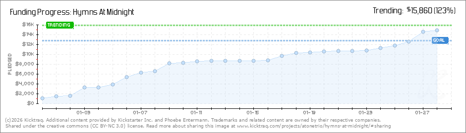 Help your backers reach your daily goals and help others see how you're doing. It's easy, with Kicktraq Mini.Here are a few quick snippits of code you can use to embed your personalized widget on your website, in your blog, and even on your favorite forum.
