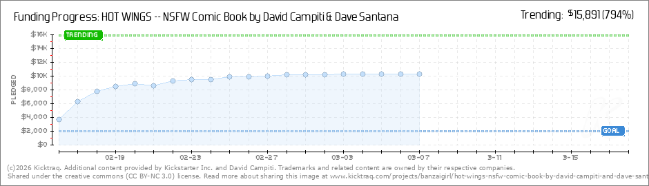 Hey! -- HOT WINGS has just passed $10,000, its first PUSH GOAL REWARD! That means we'll bee adding a new four-page section to the print and digital versions of HOT WINGS #1. The next goals aren't far away -- We contniue to add new Rewards and Add-Ons... (Read More)