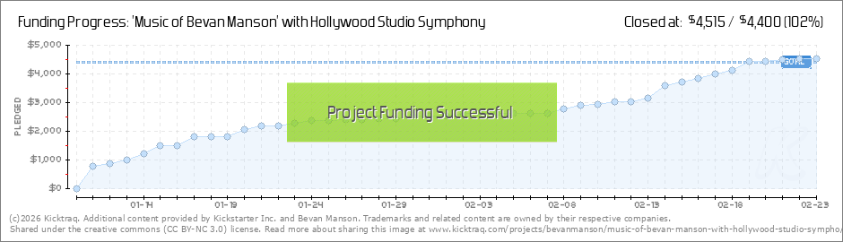 Hello all, Thank you again for contributing to 'Music of Bevan Manson with the Hollywood Studio Symphony'. It's been wonderful to see the interest coming in from all over the country and elsewhere-New York, Chicago, Redlands, New England, New Mexico,... (Read More)