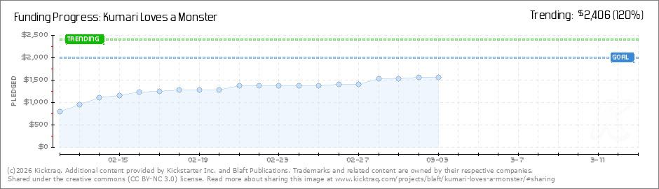 Help your backers reach your daily goals and help others see how you're doing. It's easy, with Kicktraq Mini.Here are a few quick snippits of code you can use to embed your personalized widget on your website, in your blog, and even on your favorite forum.