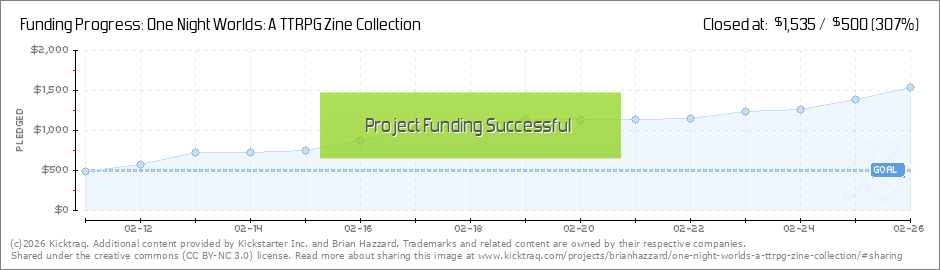Because of you, One Night Worlds is officially funded! With our minimum funding goal achieved, we can celebrate knowing that these Zines are coming to print. This milestone means more than you might realize. If you've never published an RPG before,... (Read More)