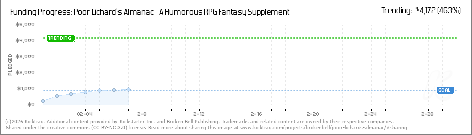 Help your backers reach your daily goals and help others see how you're doing. It's easy, with Kicktraq Mini.Here are a few quick snippits of code you can use to embed your personalized widget on your website, in your blog, and even on your favorite forum.