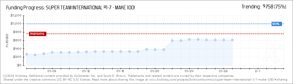 Greetings Comics Fans!Just wanted to give a quick update as we push into week 2 of the SUPER TEAM INT'L #7 Kickstarter. First, we have a new reward tier! For a $200 pledge, you will receive a copy of issues 1-6 signed by the entire creative team!... (Read More)
