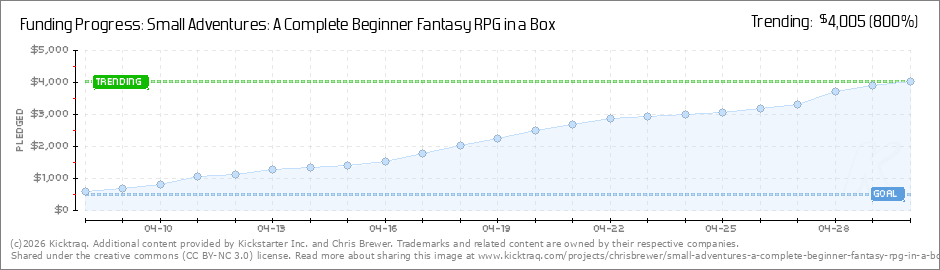 Thanks to all of you, Small Adventures funded in less than 12 hours!! Not too long after that, we passed $1,000! We've unlocked stretch goals for a premium paper upgrade for the book, as well as a sticker set! Thank you so much. Next up is our $1,250... (Read More)