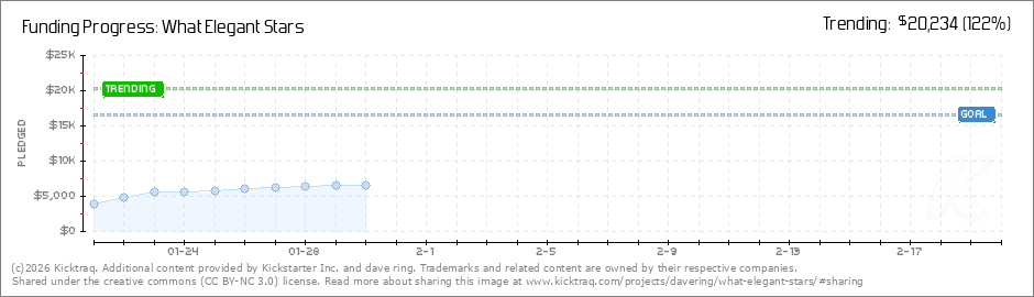 Help your backers reach your daily goals and help others see how you're doing. It's easy, with Kicktraq Mini.Here are a few quick snippits of code you can use to embed your personalized widget on your website, in your blog, and even on your favorite forum.