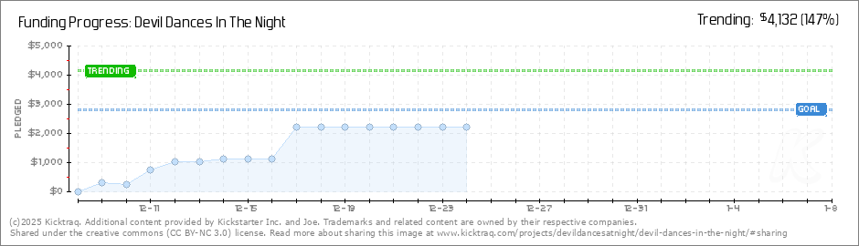 Help your backers reach your daily goals and help others see how you're doing. It's easy, with Kicktraq Mini.Here are a few quick snippits of code you can use to embed your personalized widget on your website, in your blog, and even on your favorite forum.