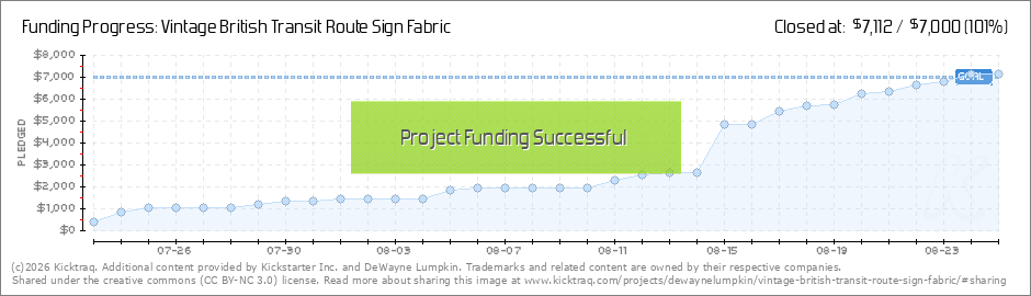 We truly appreciate and get excited over every pledge that comes through Kickstarter.com to support our Campaign to print 200 yards of British Transit Route Sign Fabric! Most have been from loyal clients, friends, friends-of-friends & family.... (Read More)