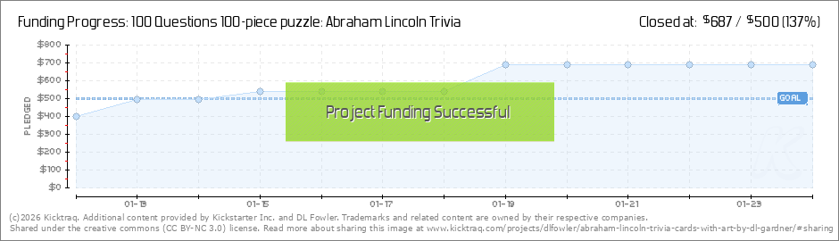 A launch date has been set -- January 12, 2026. We've also changed the title of our campaign to 100 Questions 100-piece puzzle: Abraham Lincoln Trivia. The change reflects a new twist to the trivia game and our selection to be spotlighted as a Make... (Read More)
