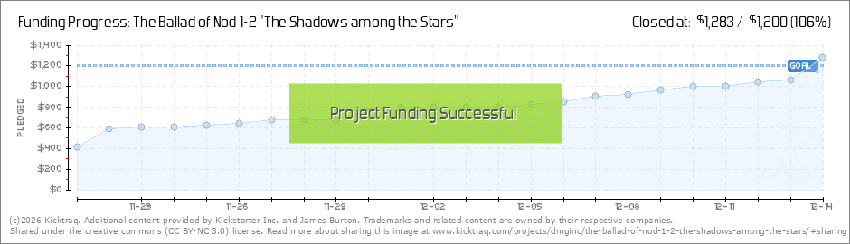 The Ballad of nod shot past 45 today!!That means that we are past 45 backers I am happy to see so many people wanting to enjoy somthing I worked so hard. However now I have to do the readiing gall darn it! The house is quite noisy at the moment... (Read More)