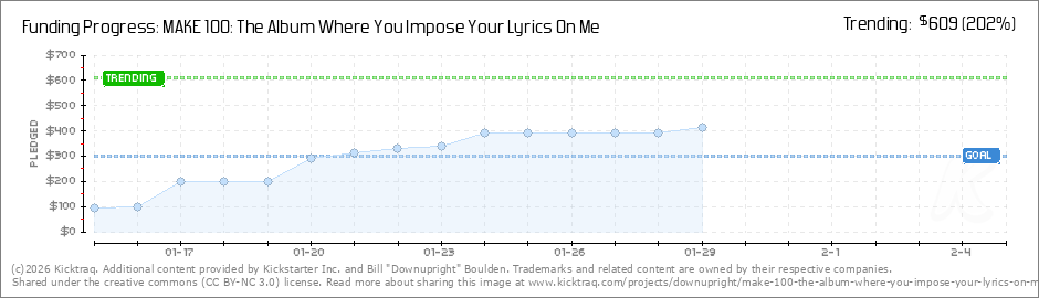 Help your backers reach your daily goals and help others see how you're doing. It's easy, with Kicktraq Mini.Here are a few quick snippits of code you can use to embed your personalized widget on your website, in your blog, and even on your favorite forum.