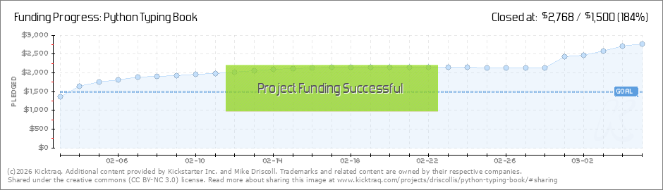 Hi, Only four more days before the campaign for Python Typing is over! Thanks so much for your support! I wanted to let you all know that I am busily creating more chapters for the book. I finished chapter 5 last week and wrote up the code examples... (Read More)