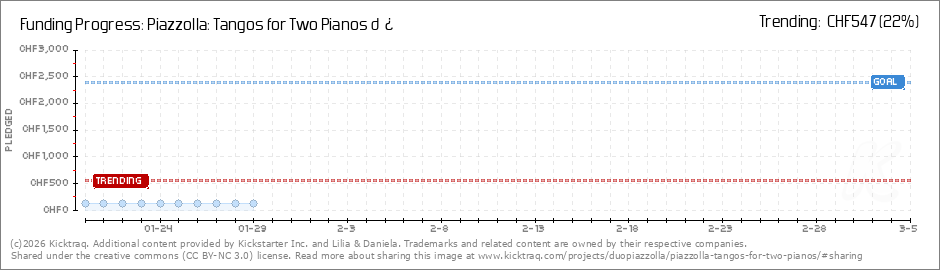 Help your backers reach your daily goals and help others see how you're doing. It's easy, with Kicktraq Mini.Here are a few quick snippits of code you can use to embed your personalized widget on your website, in your blog, and even on your favorite forum.
