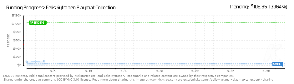 Wow! I'm speechless. You folks funded the project in under 1 hour! I'm honestly awestruck. Thank you so much for backing the playmats! I look forward to us reaching the stretch goals! Best regards, Eelis (Read More)