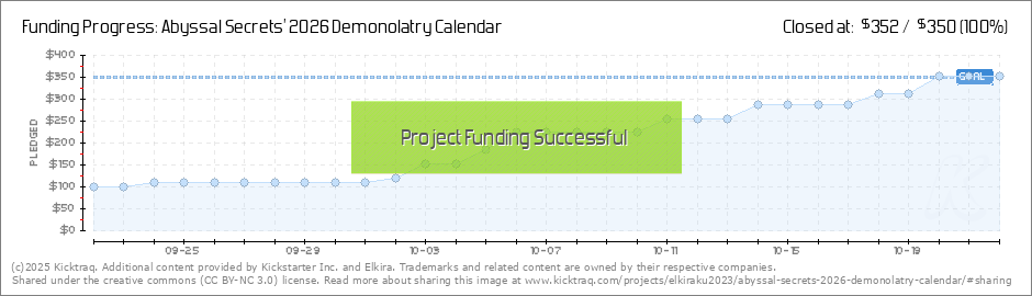 Help your backers reach your daily goals and help others see how you're doing. It's easy, with Kicktraq Mini.Here are a few quick snippits of code you can use to embed your personalized widget on your website, in your blog, and even on your favorite forum.