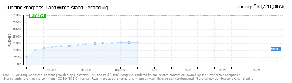 Help your backers reach your daily goals and help others see how you're doing. It's easy, with Kicktraq Mini.Here are a few quick snippits of code you can use to embed your personalized widget on your website, in your blog, and even on your favorite forum.