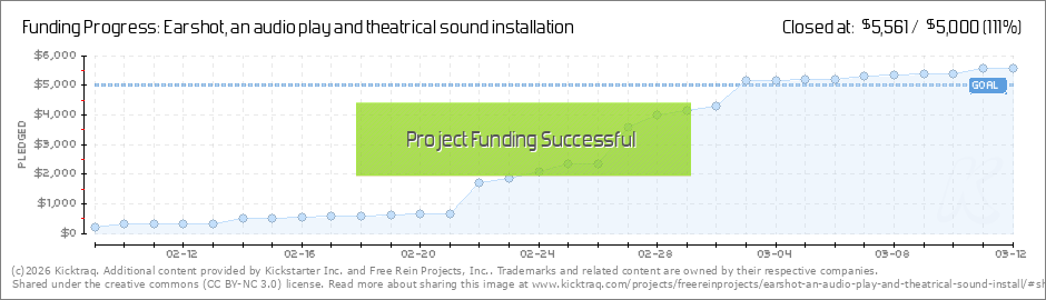 Hello Supporters, We've reached over 80% of our goal, thanks to your help! We see our supporters as part of the EARSHOT community– your excitement for the project gives us encouragement and attracts more artistically adventurous people to find... (Read More)