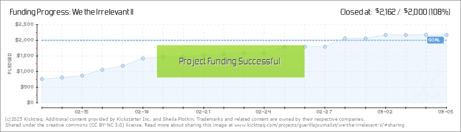 To my 15 (one in cash) wonderful backers, thank you! You brought me to 38% of my funding goal in 12 hours yesterday. I'm deeply appreciative. I promise to keep you updated on my progress. Please let your friends know about We the Irrelevant. That... (Read More)