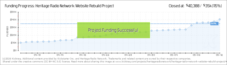 This afternoon, with the support of 462 backers, Heritage Radio Network reached our $35,000 funding goal. To all of our backers, thank you! You have have made this giant leap forward possible, and we can't wait to start working in earnest on a new... (Read More)
