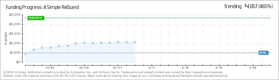 Help your backers reach your daily goals and help others see how you're doing. It's easy, with Kicktraq Mini.Here are a few quick snippits of code you can use to embed your personalized widget on your website, in your blog, and even on your favorite forum.