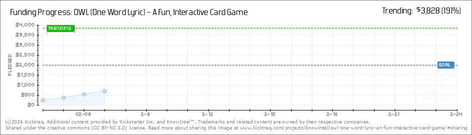 Help your backers reach your daily goals and help others see how you're doing. It's easy, with Kicktraq Mini.Here are a few quick snippits of code you can use to embed your personalized widget on your website, in your blog, and even on your favorite forum.