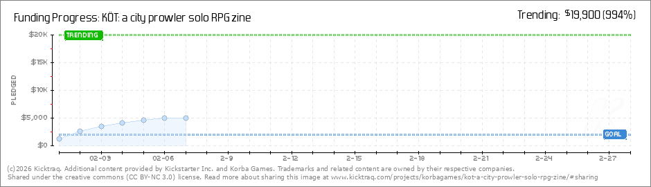 Help your backers reach your daily goals and help others see how you're doing. It's easy, with Kicktraq Mini.Here are a few quick snippits of code you can use to embed your personalized widget on your website, in your blog, and even on your favorite forum.