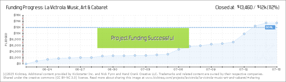 Folks, with about 30 hours left, we have hit our initial goal of $12,000. Thank you to all the lovely folks who are supporting La Victrola, and her hard-working volunteers. We're going to add a stretch goal, and will be posting it shortly. We're... (Read More)