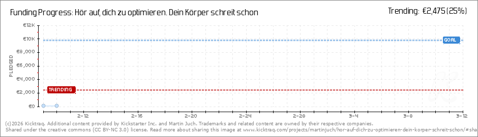 Help your backers reach your daily goals and help others see how you're doing. It's easy, with Kicktraq Mini.Here are a few quick snippits of code you can use to embed your personalized widget on your website, in your blog, and even on your favorite forum.