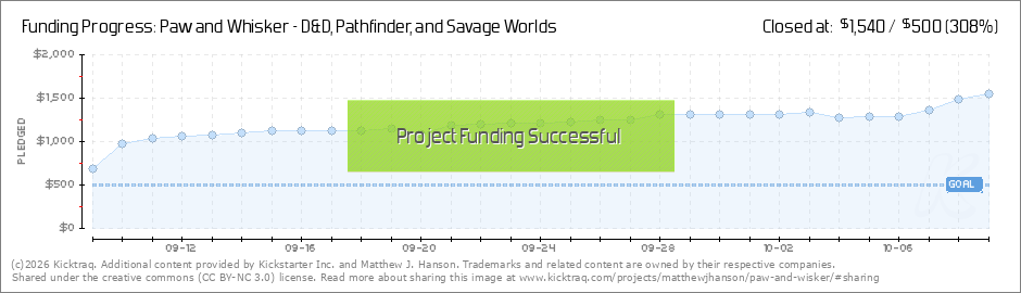Hello Paw and Whisker backers, We’re starting to head into the home stretch, with about one week left in the campaign! Chat TonightI’ve been invited to a chat tonight at the RandomWorlds TTRPG Discord sever. The chat starts at 7:30 pm Central... (Read More)