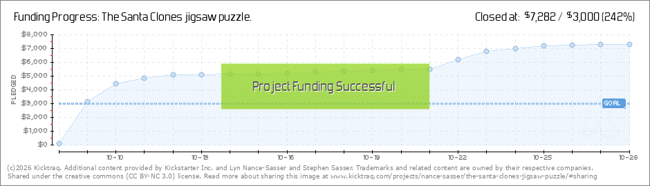 A great big thank-you to all of who have pledged to The Santa Clones jigsaw puzzle. We reached our projected goal but there's still time to support the creation of our challenging puzzle. This year you will have an extra connection to The Santa... (Read More)