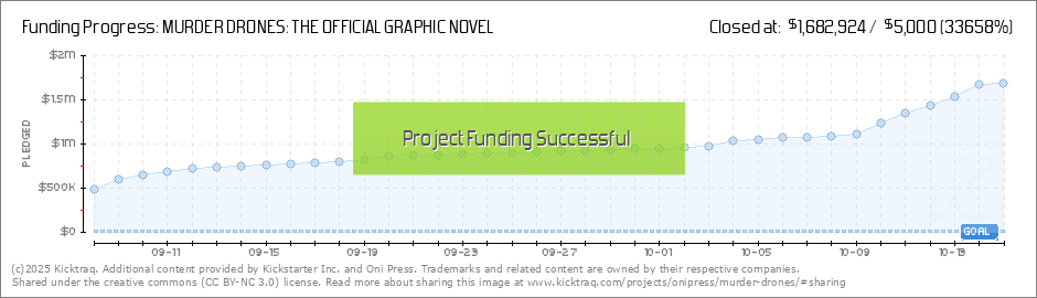 Hello, fellow Worker Drones! We knew everyone LOVED Murder Drones, but we didn’t know you loved it all enough to get it funded within FIVE MINUTES of the campaign opening! That’s WILD! On behalf of Glitch, Oni Press, and our comics creators... (Read More)
