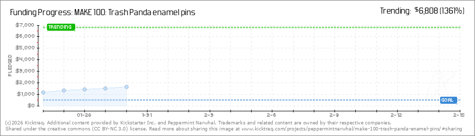 This might be a record - but we've already met our funding goal! We're very excited about these new racoon pins, so thanks to the first 13 backers who helped make it happen. The campaign runs through February 15, so stay tuned for more updates. (Read More)