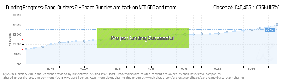 We did it! Thanks to your incredible support, the first stretch goal of €35,000 has been unlocked!This means Bang² Busters 2 will officially be released on Neo Geo AES (US & JPN), MVS (US & JPN), and Dreamcast (US, JPN & PAL)! Your... (Read More)